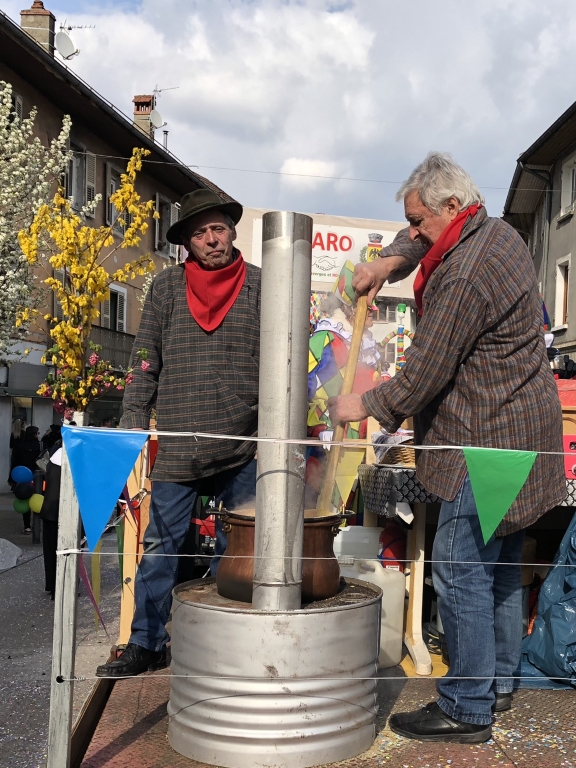L’un des moments forts a été la cuisine en direct sur le char : nos amis italiens ont préparé de la polenta dans un chaudron posé sur un poêle, une tradition gourmande qui a enchanté les spectateurs. À la fin du défilé, la convivialité était au rendez-vous avec la distribution gratuite de polenta et de saucisses, appelées « Cotechini » en bergamasque, servies par Corine, Giovanni et Luciano.